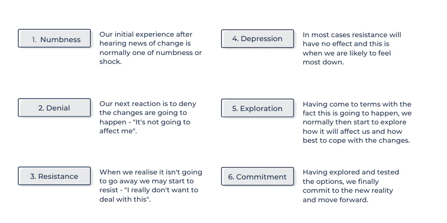 When change is upon us, everyone will progress through certain stages at different paces, including: